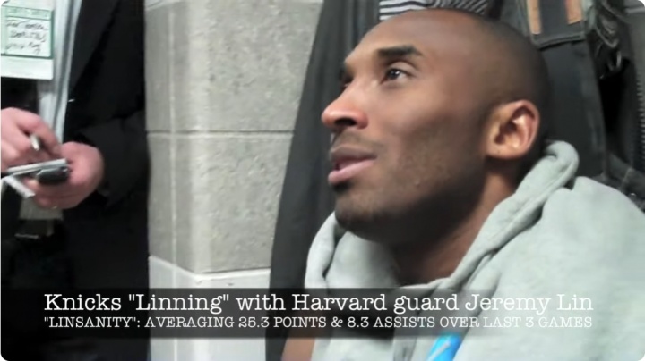 2012年2月,在战胜凯尔特人的赛后,记者向科比提起了联盟当下的“林疯狂”,但科比似乎并不了解此事,他回答说:“我不知道他(林书豪)做了什么。我知道他是谁,但我真的不太了解正在发生什么事情,我也不知道你们在谈论什么,但我今晚会看一看录像的。”